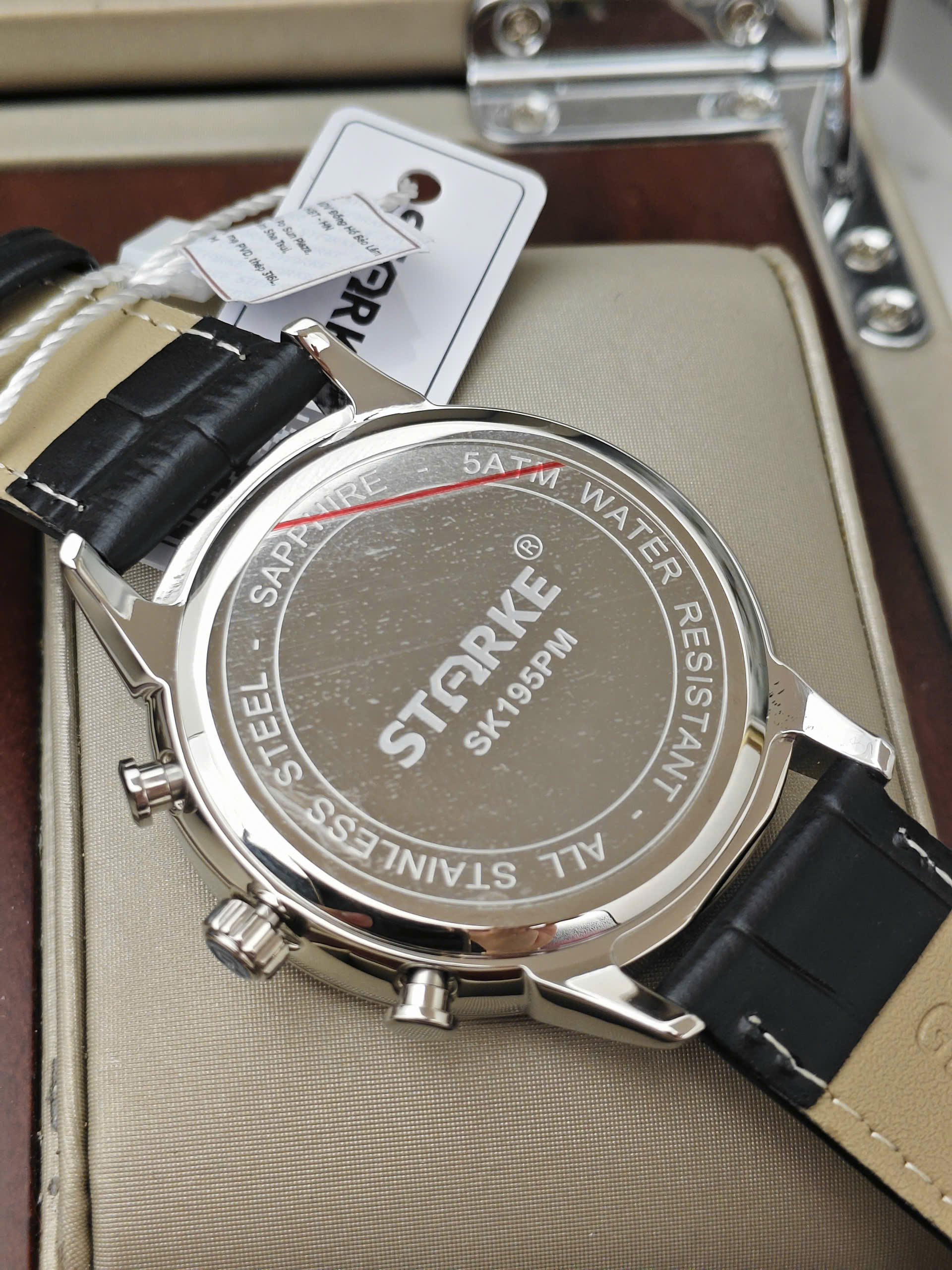 Chất liệu cao cấp và độ bền bỉ vượt trội Không chỉ gây ấn tượng bởi ngoại hình, Starke SK195PM-SBW còn được chế tác từ những vật liệu hàng đầu trong ngành đồng hồ để đảm bảo giá trị sử dụng lâu dài. Mặt kính được trang bị đá Sapphire nguyên khối có khả năng chống trầy xước gần như tuyệt đối, bảo vệ mặt số luôn sáng bóng trước các va chạm hàng ngày. Toàn bộ khung vỏ và dây đeo đều làm từ thép không gỉ 316L chuyên dụng, kết hợp cùng công nghệ mạ PVD đen bền màu, không chỉ mang lại độ bóng bẩy sắc sảo mà còn chống ăn mòn và oxy hóa hiệu quả, giữ cho sản phẩm luôn đẹp như mới qua thời gian.
