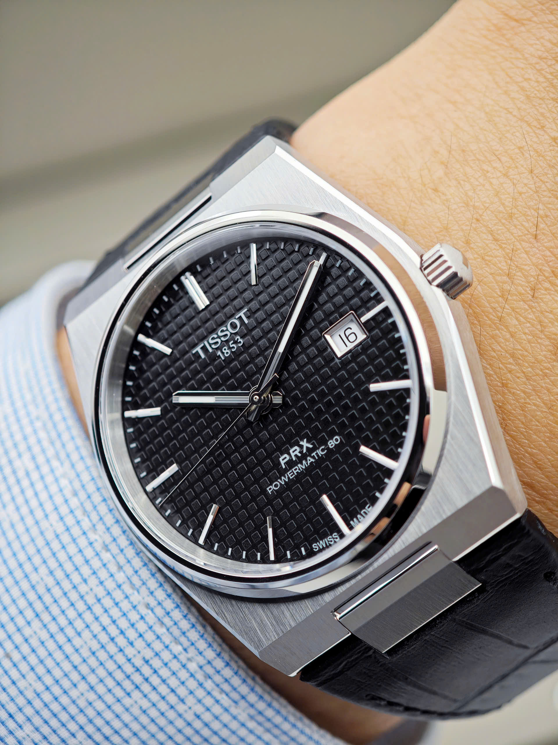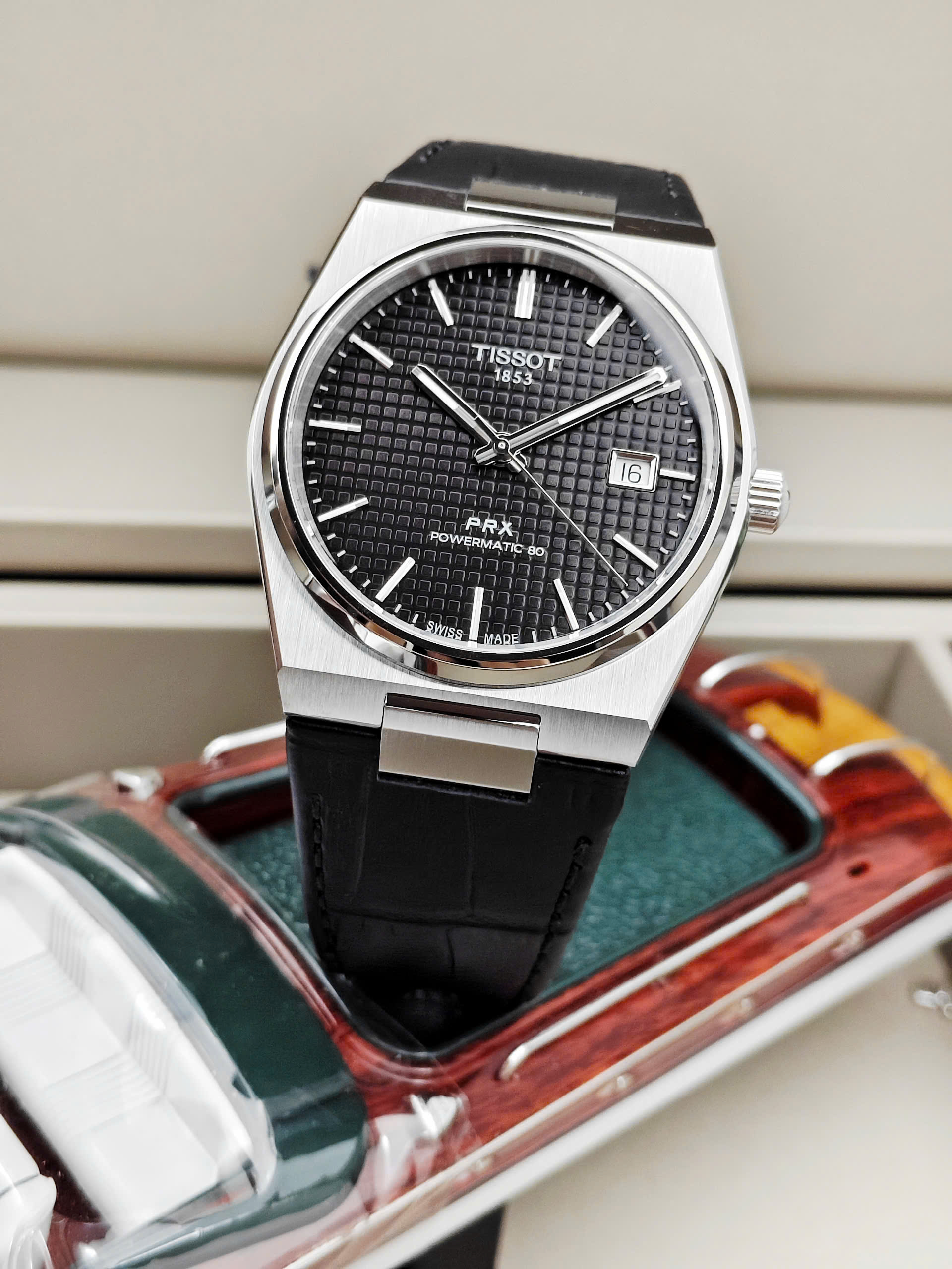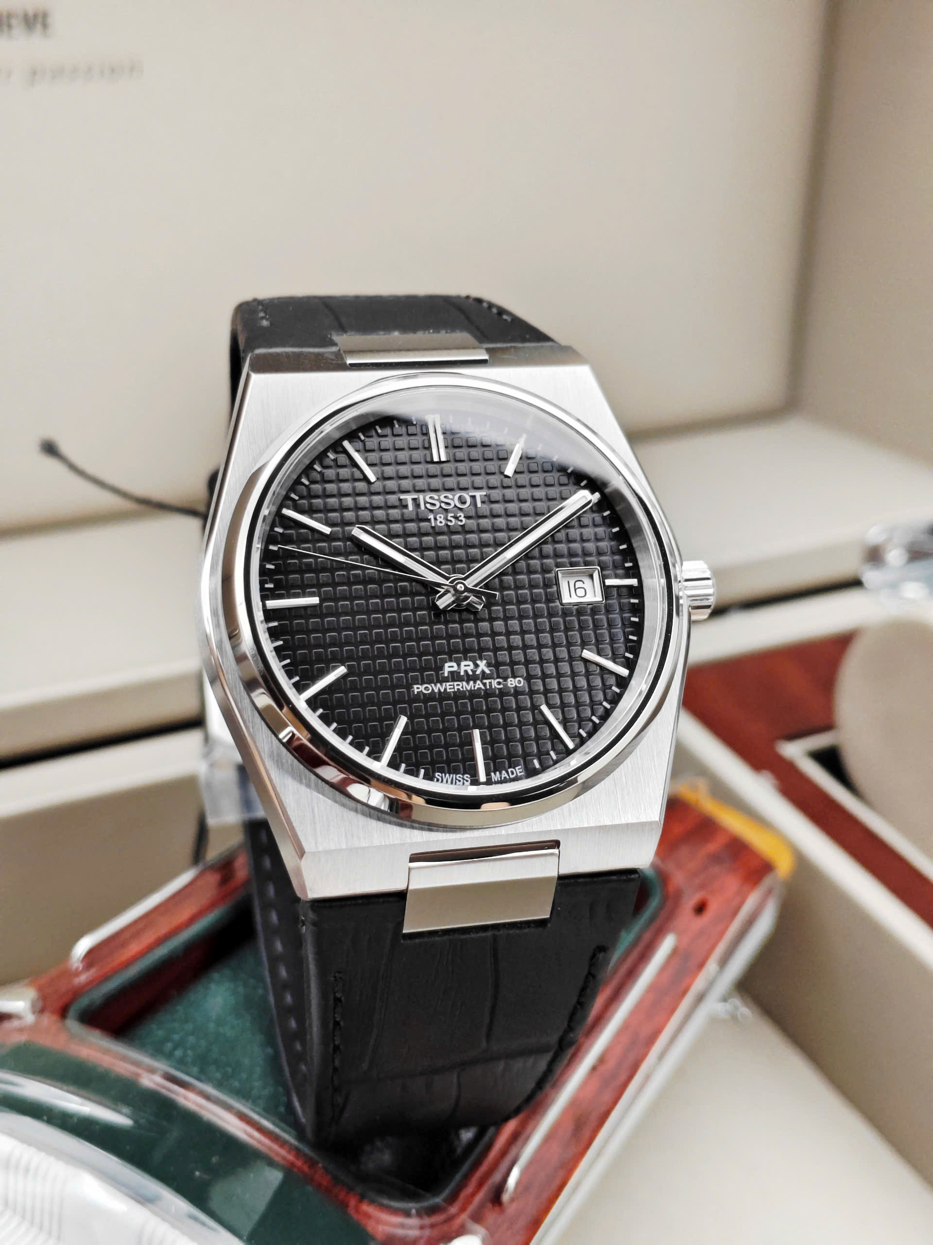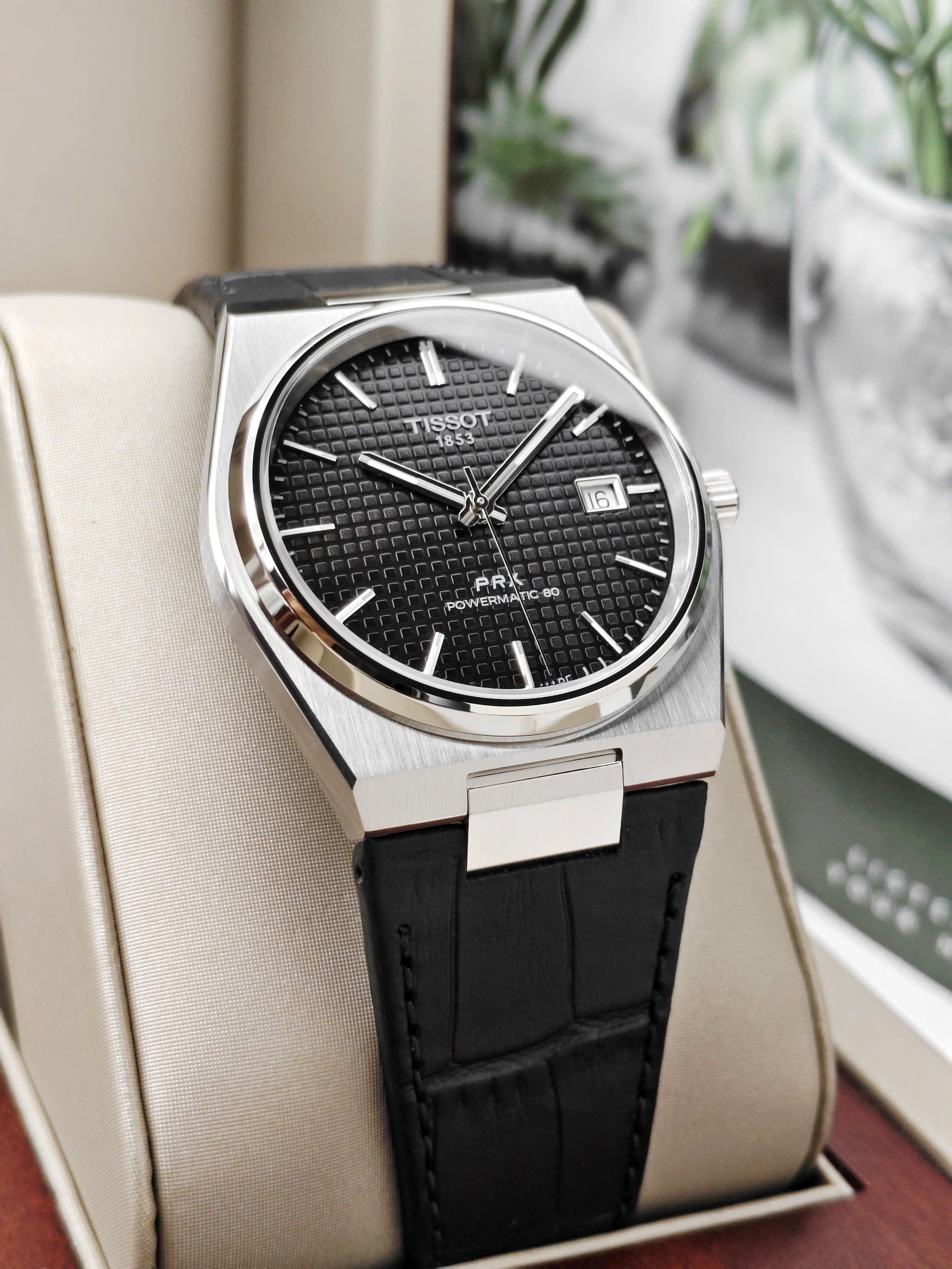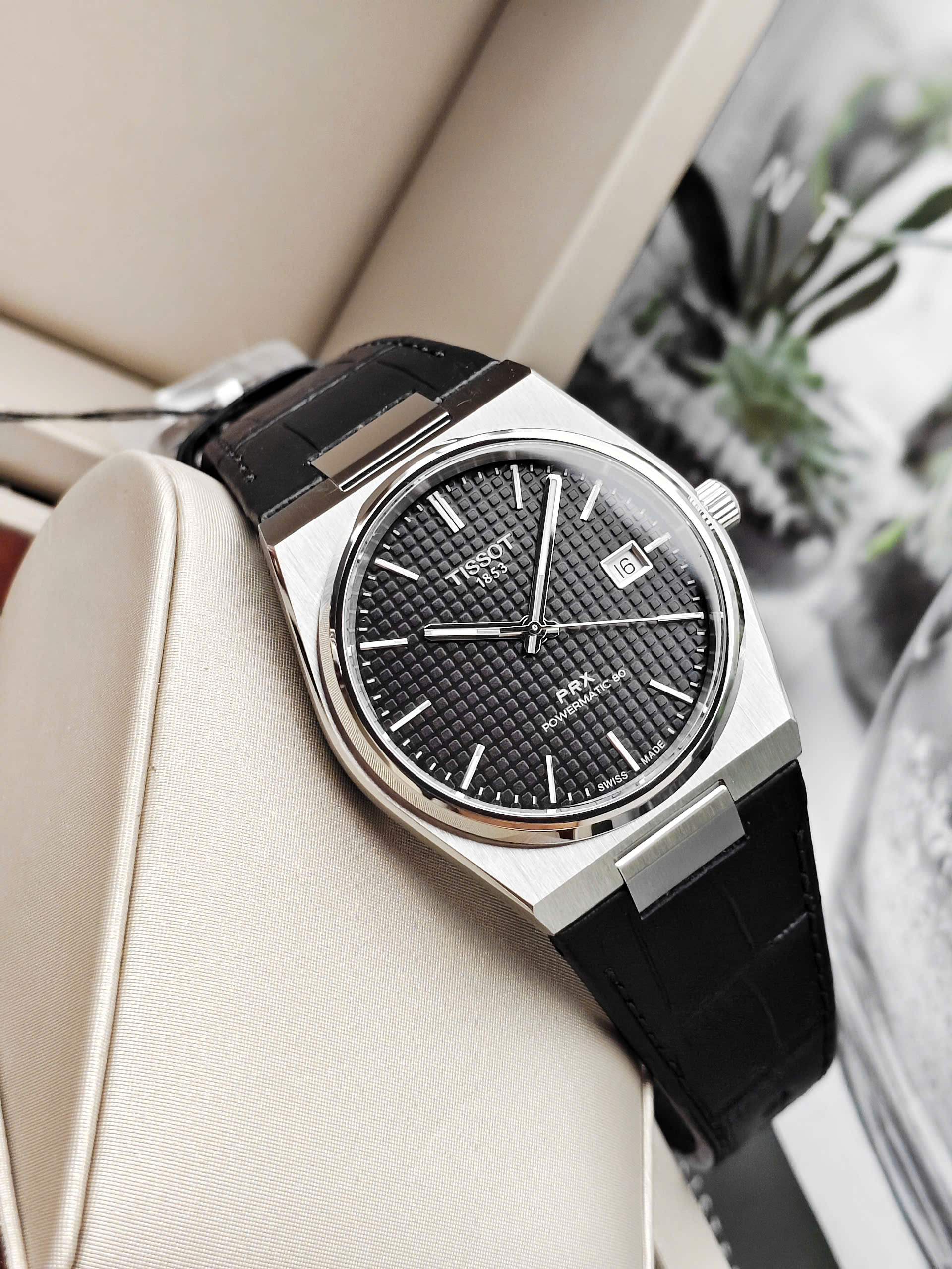 Thiết Kế Thể Thao Sang Trọng Và Khác Biệt Tissot PRX Powermatic 80 nổi bật với khung vỏ dạng Tonneau (hình thùng) đặc trưng, tạo nên sự giao thoa hoàn hảo giữa nét cổ điển của những năm 1970 và phong cách hiện đại. Mặt số đen huyền bí được trang trí bằng họa tiết Guilloche tinh xảo (các ô vuông nhỏ nổi), giúp tăng chiều sâu và vẻ cao cấp cho sản phẩm. Kết hợp cùng dây đeo bằng da bò dập vân cá sấu màu đen, chiếc đồng hồ này là lựa chọn lý tưởng cho những quý ông yêu thích sự mạnh mẽ nhưng vẫn đầy tinh tế.